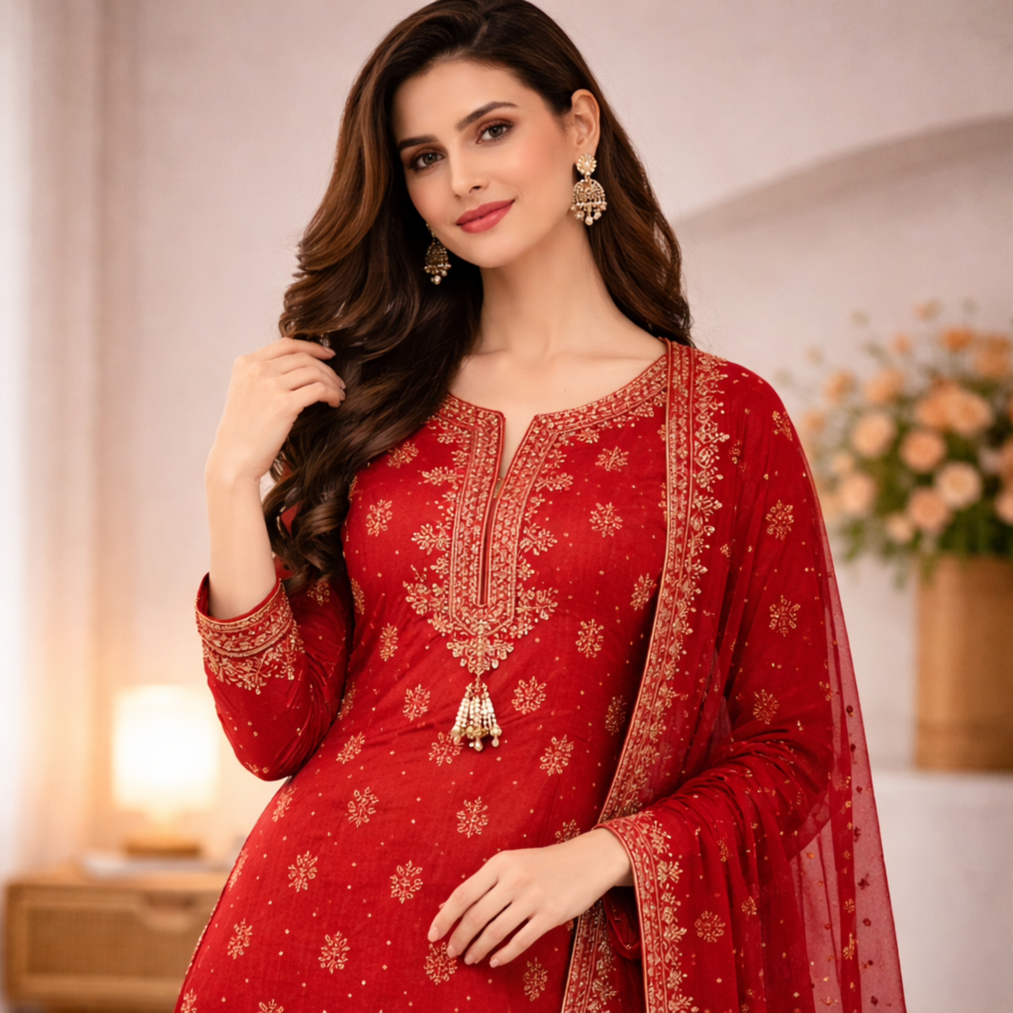 Make a statement at festive celebrations with this red embroidered party wear salwar suit for women. Featuring rich embroidery, a graceful silhouette, and a matching dupatta, it is perfect for weddings, festivals, and special occasions.
